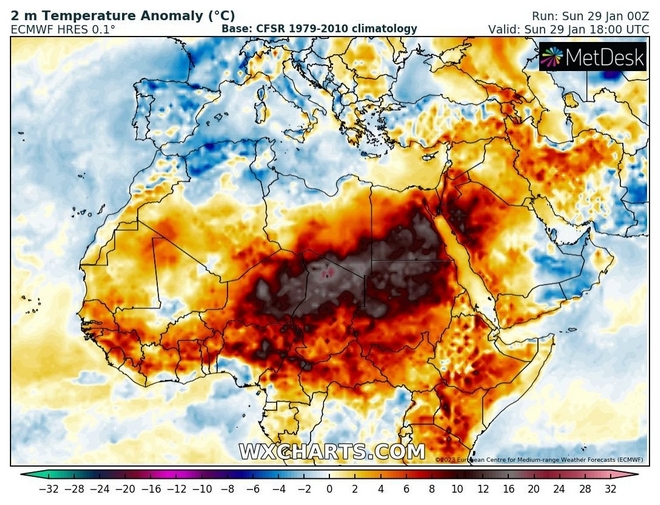 Οι χιονοπτώσεις μέχρι στιγμής ήταν κατά πολύ περισσότερες στο Μαρόκο όπου το χιόνι κάλυψε τις περιοχές από 600 μέτρα υψόμετρο και πάνω, ενώ μέχρι χθές επικρατούσε ισχυρός καύσωνας σε μεγάλο μέρος της υποσαχάριας περιοχής. Στο Τσαντ η θερμοκρασία έφτασε 40. 7°C στα Bokoro, ενω η μέση μέγιστη θερμοκρασία στην Τζαμένα αυτή την περίοδο είναι οι 32°C.