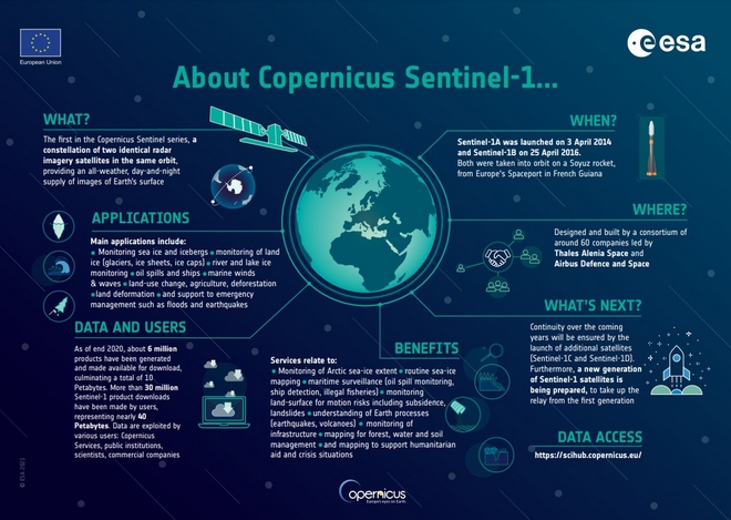 Οι δορυφόροι Copernicus Sentinel έχουν πολλές δυνατότητες. Ο δορυφόρος Sentinel-1, για παράδειγμα, χρησιμοποιεί απεικόνιση ραντάρ για να τραβήξει εικόνες της επιφάνειας της Γης, ακόμη και μέσα σε σύννεφα ή σε σκοτάδι. Αυτές οι εικόνες μπορούν να χρησιμοποιηθούν για τη χαρτογράφηση και την παρακολούθηση των αλλαγών στην κάλυψη του χιονιού και του πάγου, συμπεριλαμβανομένης της έκτασης των παγετώνων, του θαλάσσιου πάγου και της κάλυψης χιονιού στην ξηρά.