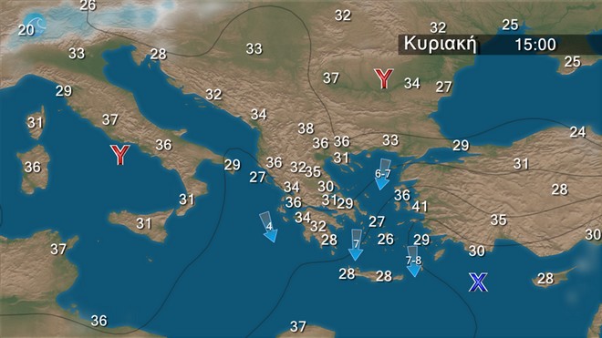 Σήμερα, Σάββατο οι θερμοκρασίες θα φτάσουν τοπικά στα δυτικά και βόρεια και τα κεντρικά τους 39 με 40 βαθμούς Κελσίου ενώ το μελτέμι τοπικά στο κεντρικό και νότιο Αιγαίο θα φτάνει τα 7 Μποφόρ κατά την διάρκεια της ημέρας με τάση ενίσχυσης.