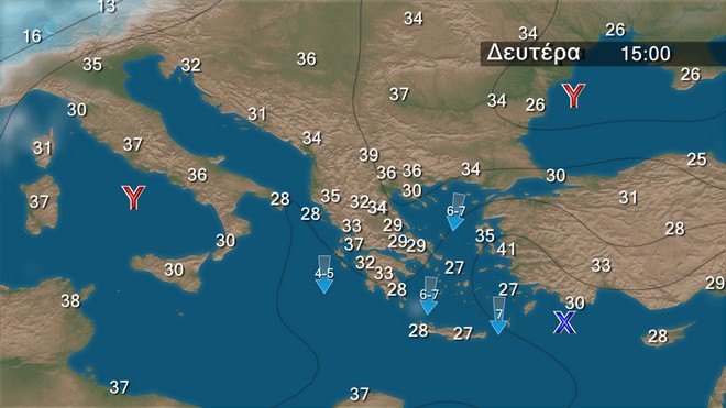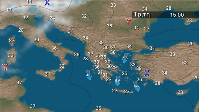 Γενικά αίθριος καιρός. Οι άνεμοι θα πνέουν από βόρειες διευθύνσεις με ένταση, 4 με 6 και στο Αιγαίο 7 τοπικά 8 μποφόρ. Η θερμοκρασία θα σημειώσει μικρή πτώση στα βορειοανατολικά, αλλά θα παραμείνει σε υψηλά επίπεδα στη δυτική Ελλάδα και το ανατολικό Αιγαίο. Στην Αθήνα η μέγιστη θερμοκρασία προβλέπεται στους 35 βαθμούς Κελσίου και στη Θεσσαλονίκη στους 36 βαθμούς Κελσίου.