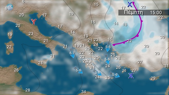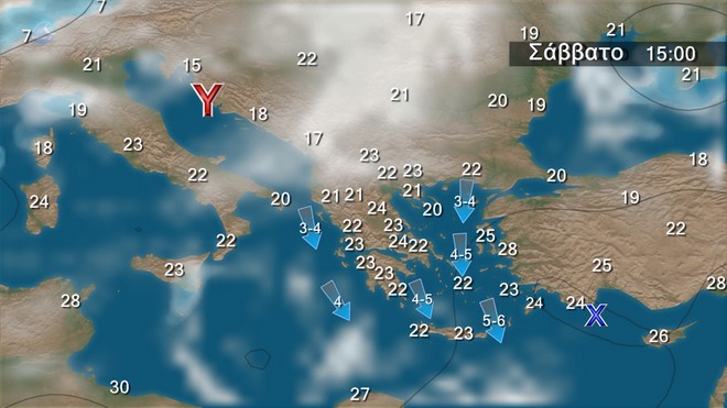 Στα δυτικά, τα κεντρικά και τα βόρεια προβλέπονται λίγες νεφώσεις που βαθμιαία θα αυξηθούν και θα σημειωθούν τοπικές βροχές, κυρίως στα δυτικά και βόρεια. Το βράδυ στα βορειοδυτικά θα εκδηλωθούν μεμονωμένες καταιγίδες. Στις υπόλοιπες περιοχές θα υπάρχουν αραιές νεφώσεις κατά διαστήματα. Οι συγκεντρώσεις αφρικανικής σκόνης στην ατμόσφαιρα βαθμιαία θα μειωθούν και θα περιοριστούν στα νότια. Οι άνεμοι θα πνέουν αρχικά δυτικοί βορειοδυτικοί 3 με 5 μποφόρ, που γρήγορα θα στραφούν σε δυτικούς νοτιοδυτικούς και θα φθάσουν στα πελάγη τοπικά 6 μποφόρ. Στα νοτιοανατολικά θα παραμείνουν βορειοδυτικοί με ένταση έως 5 μποφόρ. Η θερμοκρασία θα σημειώσει μικρή πτώση σε όλη τη χώρα.