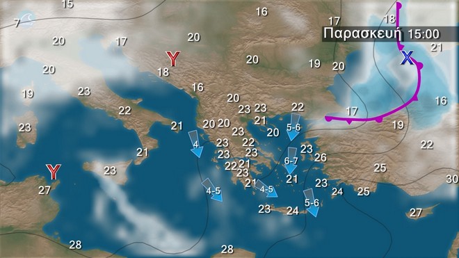 Στα δυτικά γενικά αίθριος καιρός. Στα ανατολικά θα υπάρχουν λίγες νεφώσεις παροδικά αυξημένες, με τοπικές βροχές τις πρωινές ώρες στη Θράκη και την ανατολική νησιωτική χώρα. Οι άνεμοι θα πνέουν βόρειοι βορειοδυτικοί 5 με 6 και πρόσκαιρα στο Αιγαίο τοπικά 7 μποφόρ, με βαθμιαία εξασθένηση. Η θερμοκρασία θα σημειώσει μικρή πτώση στα ανατολικά.