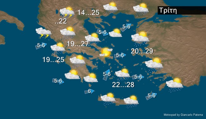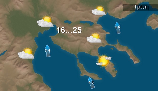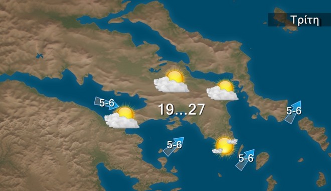 Την Τρίτη στα δυτικά και τα βόρεια προβλέπονται βροχές και σποραδικές καταιγίδες, πιθανώς κατά τόπους ισχυρές τις πρωινές ώρες στα βορειοδυτικά. Βαθμιαία εξασθένηση το απόγευμα από τα δυτικά. Στα υπόλοιπα θα επικρατήσει άστατος καιρός με πιθανότητα τοπικών βροχών μέχρι το μεσημέρι και σταδιακή βελτίωση. Οι άνεμοι θα πνέουν από δυτικές διευθύνσεις 4 με 6 και βαθμιαία τοπικά 7 μποφόρ Η θερμοκρασία θα σημειώσει μικρή πτώση στα δυτικά και τα βόρεια και θα έχει μέγιστη τιμή στα βόρεια τους 22 με 25 βαθμούς, στα υπόλοιπα ηπειρωτικά και το Ιόνιο τους 25 με 27 βαθμούς Κελσίου, στις Κυκλάδες και την Κρήτη τους 28 και το Ανατολικό Αιγαίο τους 29 βαθμούς Κελσίου.