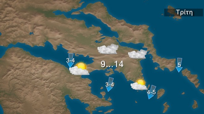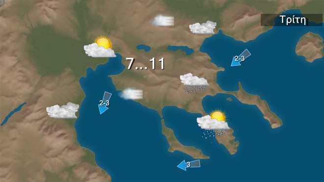 Την Τρίτη προβλέπονται νεφώσεις παροδικά αυξημένες με ασθενείς τοπικές βροχές κυρίως στην κεντρική Μακεδονία, την ανατολική Θεσσαλία, τις Σποράδες, την Εύβοια, τη βόρεια Κρήτη και το Ιόνιο, και πρόσκαιρα μέχρι τις πρωινές ώρες στην ανατολική Μακεδονία και τη Θράκη, όπου θα πέσουν και λίγα χιόνια στα ορεινά. Η ορατότητα τις πρωινές και τις βραδινές ώρες θα είναι κατά τόπους περιορισμένη κυρίως στα κεντρικά και τα βόρεια ηπειρωτικά και πιθανώς τις πρωινές ώρες να σχηματιστούν ομίχλες. Οι άνεμοι στα δυτικά θα είναι μεταβλητοί ασθενείς. Στα ανατολικά θα πνέουν από βόρειες διευθύνσεις 3 με 4, στο Αιγαίο 5 με 6 μποφόρ. Η θερμοκρασία δεν θα σημειώσει αξιόλογη μεταβολή και θα έχει μέγιστη τιμή στα βόρεια τους 11 βαθμούς, στα υπόλοιπα ηπειρωτικά και το Ιόνιο τους 15 με 17 βαθμούς Κελσίου, στις Κυκλάδες και την Κρήτη τους 16 βαθμούς και στο Ανατολικό Αιγαίο και τα Δωδεκάνησα τους 17 βαθμούς Κελσίου.