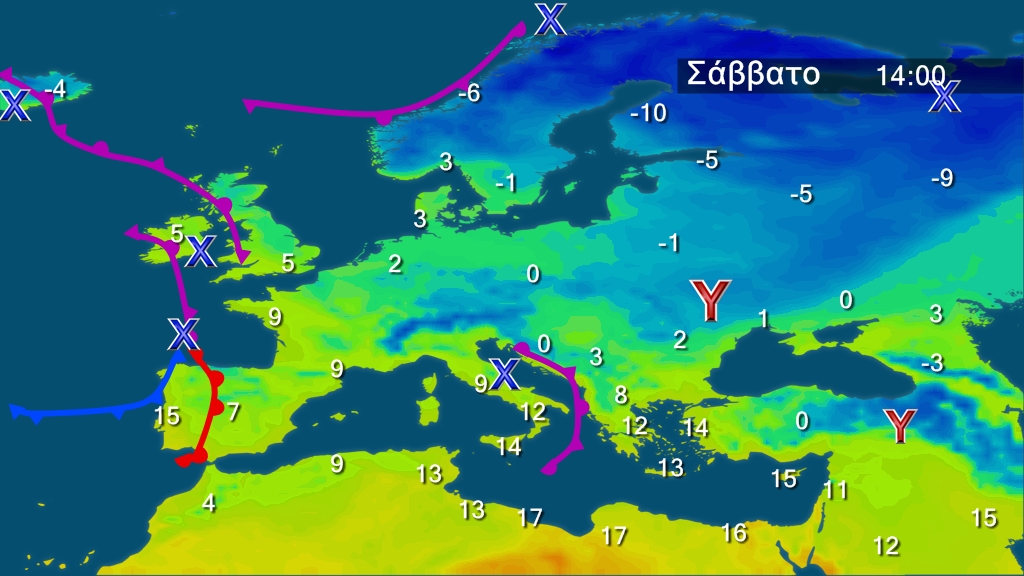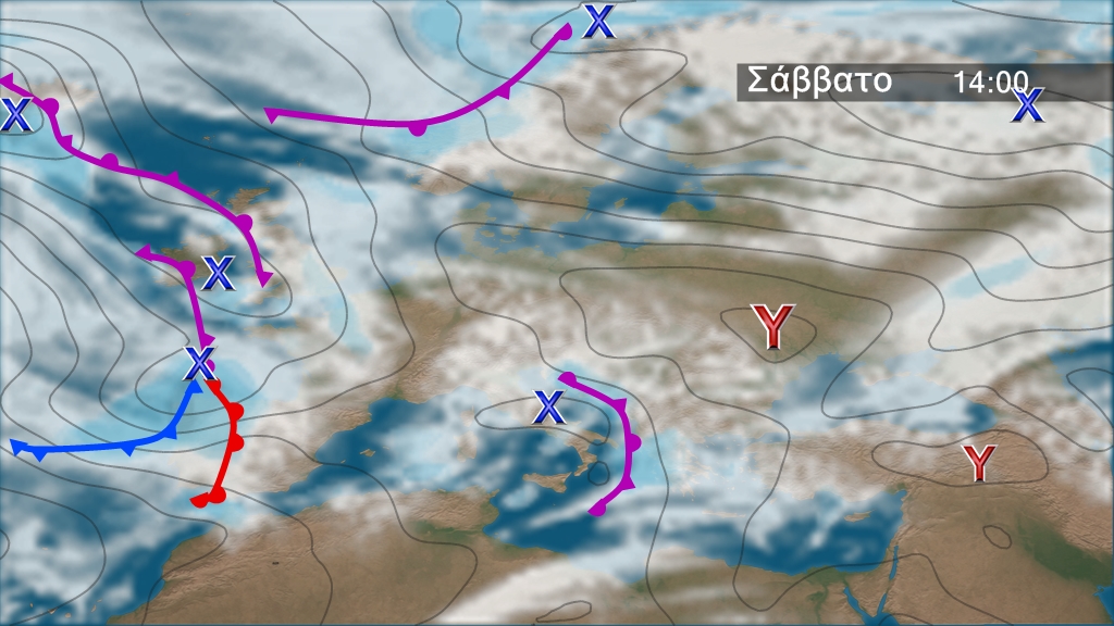 Με τοπικές νεφώσεις θα κυλήσει ο καιρός το Σάββατο με φαινόμενα κυρίως στα δυτικά τα βόρεια και το ανατολικό Αιγαίο, ενώ η θερμοκρασία θα κυμαίνεται σε καλά επίπεδα και οι άνεμοι δεν θα ξεπερνούν τα 5 με 6 μποφόρ στα πελάγη. Στην χάρτη των βαρομετρικών συστημάτων της Ευρώπης παρατηρούμε ότι στη Ιταλία υπάρχει ένα βαρομετρικό χαμηλό το οποίο δημιουργεί νοτιοδυτικό ρεύμα σε όλη τη χώρα.