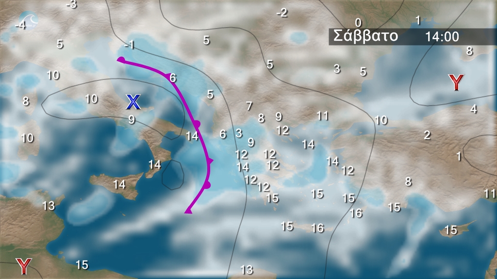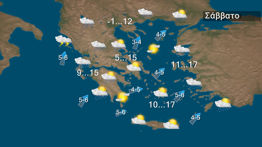 Στον χάρτη της Βαλκανικής που ακολουθεί διακρίνεται το χαμηλό στην Ιταλία το οποίο κινείται ανατολικότερα προς την χώρα μας. Σε όλη τη χώρα θα υπάρχουν τοπικές νεφώσεις με φαινόμενα στα δυτικά τα βόρεια και το ανατολικό Αιγαίο και τα Δωδεκάνησα. Οι άνεμοι θα πνέουν δυτικοί νοτιοδυτικοί 4 με 5 και τοπικά στα νότια 6 μπoφόρ. Η θερμοκρασία θα φτάσει στα βόρεια τους 12 βαθμούς και στα υπόλοιπα τους 15 με 17 βαθμούς Κελσίου.