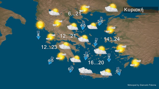 Την Κυριακή στα δυτικά, τα βόρεια, τα νησιά του ανατολικού Αιγαίου και τα Δωδεκάνησα προβλέπεται γενικά αίθριος καιρός. Στις υπόλοιπες περιοχές θα υπάρχουν νεφώσεις παροδικά αυξημένες, με ασθενείς τοπικές βροχές στην ανατολική Στερεά, την Εύβοια, τις Σποράδες και κυρίως στην Κρήτη. Οι άνεμοι θα πνέουν βόρειοι βορειοανατολικοί 4 με 6, στο Αιγαίο τοπικά 7 και τις πρωινές ώρες στο νοτιοδυτικό Αιγαίο έως 8 μποφόρ. Η θερμοκρασία θα σημειώσει μικρή άνοδο ως προς τις μέγιστες τιμές κυρίως στα δυτικά και τα βόρεια και θα έχει μέγιστη τιμή στα βόρεια τους 19 βαθμούς, στα υπόλοιπα ηπειρωτικά και το Ιόνιο τους 20 με 23 βαθμούς Κελσίου, στις Κυκλάδες και την Κρήτη τους 20 βαθμούς και στο Ανατολικό Αιγαίο και τα Δωδεκάνησα τους 24 βαθμούς Κελσίου.