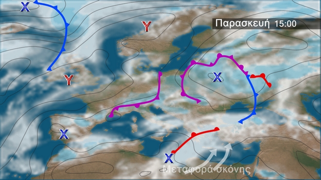 Αυξημένη συννεφιά σε όλη τη χώρα αλλά και γενικότερα στη νοτιοανατολική Ευρώπη και μεταφορά σκόνης από τις ακτές της Βόρειας Αφρικής. Έντονες βροχοπτώσεις στην ανατολική Ευρώπη και σε μέρος της κεντρικής.