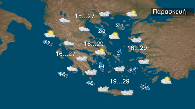 Στη χώρα μας θα υπάρχει αυξημένη συννεφιά, υγρασία σε υψηλές τιμές και τοπικές βροχές θα εκδηλωθούν κυρίως στα δυτικά. Η θερμοκρασία θα φτάσει τοπικά τους 27 με 29 βαθμούς Κελσίου.