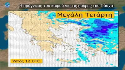 Τη Μεγάλη Τετάρτη προβλέπονται λίγες νεφώσεις τοπικά αυξημένες στα ανατολικά, στα νότια και τις μεσημβρινές και απογευματινές ώρες κυρίως στα βόρεια και ανατολικά ηπειρωτικά ορεινά. Τοπικές βροχές και πιθανόν σποραδικές καταιγίδες μέχρι το απόγευμα θα σημειωθούν στην ανατολική Μακεδονία, τη Θράκη, τα νησιά του ανατολικού Αιγαίου, τα Δωδεκάνησα και την Κρήτη. Λίγα χιόνια θα πέσουν στα ορεινά της ανατολικής Μακεδονίας και της Θράκης. Βελτίωση του καιρού μέχρι το τέλος της ημέρας σε όλη τη χώρα.