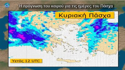 Την Κυριακή του Πάσχα προβλέπονται νεώσεις τοπικά αυξημένες αρχικά στα δυτικά και στα νησιά του ανατολικού Αιγαίου και από τις μεσημβρινές ώρες σταδιακά και στα κεντρικά και τα βόρεια με σποραδικές βροχές. Διάσπαρτες καταιγίδες θα εκδηλωθούν κυρίως στα δυτικά από το απόγευμα.