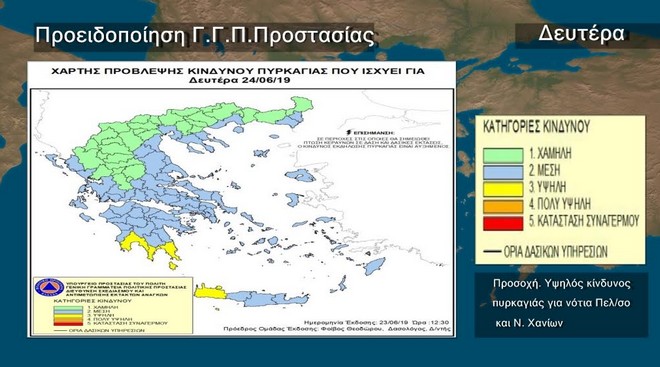 Βαθμιαία πτώση της θερμοκρασίας στα βόρεια, ενώ στα κεντρικά και τα νότια η θερμοκρασία θα διατηρηθεί σε υψηλά επίπεδα. Σποραδικές καταιγίδες στα κεντρικά και κυρίως στα βόρεια τις απογευματινές ώρες. Τοπικά υψηλή κατηγορία κινδύνου για πυρκαγιές στη νότια Πελοπόννησο και στο Νομό Χανίων σύμφωνα με την πρόβλεψη της Γενικής Γραμματείας Πολιτικής Προστασίας.