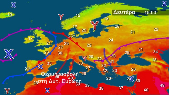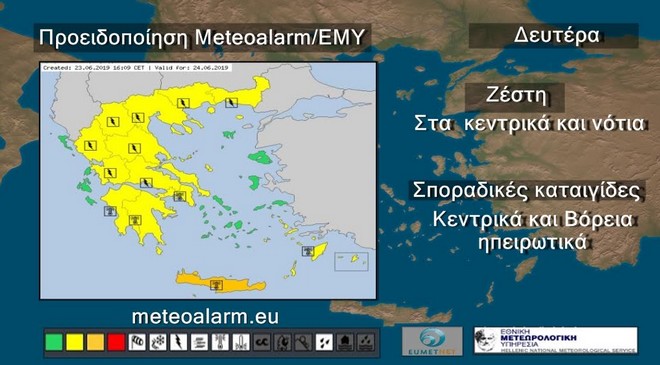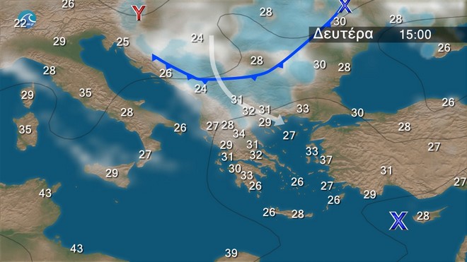 Τη Δευτέρα από τις πρωινές ώρες στη Μακεδονία και κυρίως τις μεσημβρινές και απογευματινές ώρες στη Θράκη, την Ήπειρο, τη Θεσσαλία, τις Σποράδες το βόρειο Αιγαίο και πιθανώς στην ανατολική Στερεά, προβλέπονται νεφώσεις παροδικά αυξημένες με τοπικές βροχές και σποραδικές καταιγίδες. Τα φαινόμενα πιθανώς να είναι κατά τόπους ισχυρά κυρίως στη Μακεδονία, με εξασθένηση το βράδυ. Στην υπόλοιπη χώρα θα επικρατήσει γενικά αίθριος καιρός. Οι άνεμοι στα δυτικά και τα νότια θα πνέουν δυτικοί βορειοδυτικοί 3 με 5 και βαθμιαία στα πελάγη τοπικά 6 μποφόρ. Στα υπόλοιπα βόρειοι βορειοανατολικοί 3 με 5 ενισχυόμενοι το βράδυ στο βόρειο Αιγαίο σε 6 μποφόρ. Η θερμοκρασία θα σημειώσει πτώση στα βόρεια, όμως στα νότια θα διατηρηθεί σε υψηλά επίπεδα. Θα φτάσει στα βόρεια ηπειρωτικά τους 33 με 35 βαθμούς στα δυτικά τους 35 με 37 στα υπόλοιπα ηπειρωτικά τοπικά και τους 38 βαθμούς και στα νησιά του Αιγαίου τους 33 με 35 βαθμούς Κελσίου.