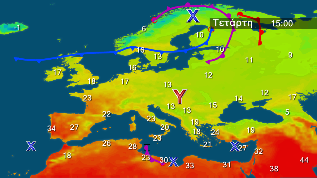 Ισχυρός αντικυκλώνας καλύπτει όλη τη Κεντρική Ευρώπη και τα Βαλκάνια που συνδυάζεται με τις χαμηλές πιέσεις της Ανατολικής Μεσογείου και προκαλεί πολύ θυελλώδεις βοριάδες και έντονη ψυχρή μεταφορά.