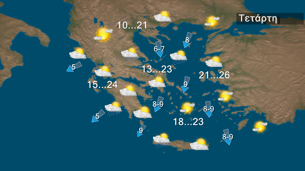 Οι αέριες μάζες θα είναι ξηρές και μέχρι αύριο φάση δεν προβλέπεται να μας επηρεάσουν με σημαντικά φαινόμενα. Από την Παρασκευή πάνω από τις θερμές θαλάσσιες περιοχές της Σύρτης και του Ιονίου θα δημιουργηθούν ευνοϊκές συνθήκες για πολλές βροχές κυρίως στα νότια που θα επεκταθούν ανατολικότερα.
