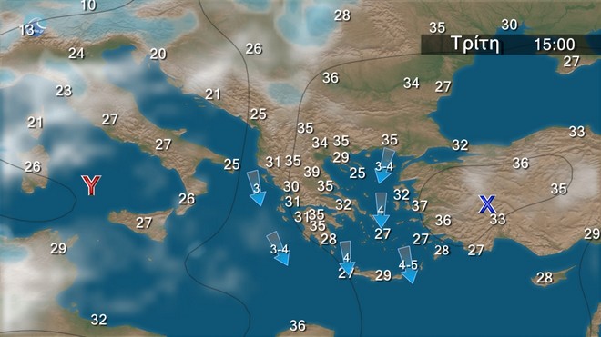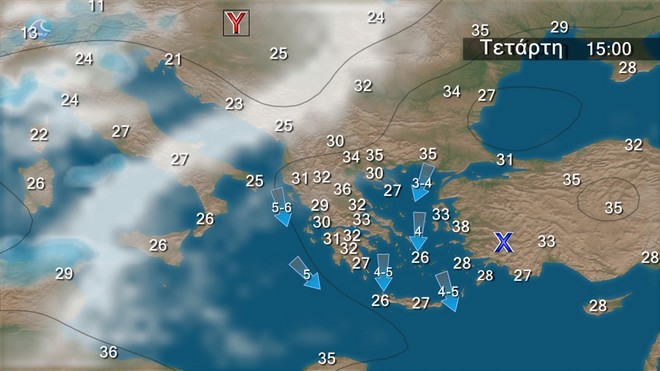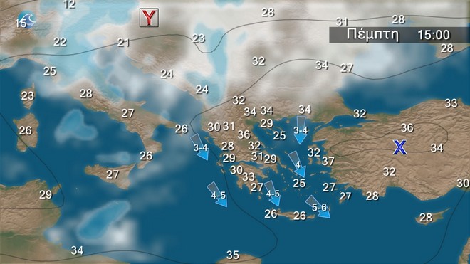 Γενικά αίθριος καιρός. Βαθμιαία στο Ιόνιο και την Ήπειρο και από το μεσημέρι στη Μακεδονία και τη Θεσσαλία θα αναπτυχθούν νεφώσεις και θα εκδηλωθούν σποραδικοί όμβροι στα ορεινά και πιθανώς μεμονωμένες καταιγίδες. Το βράδυ τα φαινόμενα θα περιοριστούν στη Μακεδονία και θα εξασθενήσουν. Οι άνεμοι θα πνέουν δυτικοί βορειοδυτικοί 3 με 5 και στο Ιόνιο πρόσκαιρα 6 μποφόρ και από το απόγευμα στα βορειοανατολικά μεταβλητοί 3 με 4 μποφόρ. Η θερμοκρασία θα σημειώσει πτώση της τάξης των 3-4 βαθμών στα βόρεια. Στην υπόλοιπη όμως χώρα θα διατηρηθεί στα ίδια υψηλά επίπεδα και στα Δωδεκάνησα και τα νησιά του ανατολικού Αιγαίου θα φθάσει τους 37 και πιθανώς τους 38 βαθμούς Κελσίου.