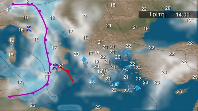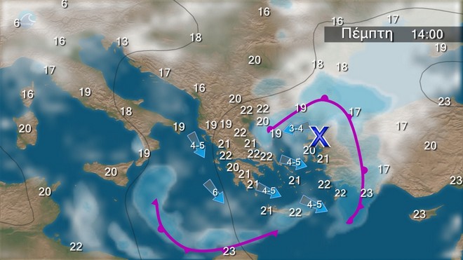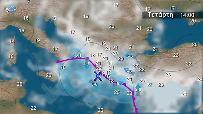 Αρχικά στα δυτικά, γρήγορα στα κεντρικά και νότια ηπειρωτικά και την Κρήτη και από το μεσημέρι βαθμιαία και στην υπόλοιπη χώρα, νεφώσεις με βροχές και καταιγίδες. Τα φαινόμενα τα οποία πιθανώς να είναι κατά τόπους ισχυρά, από το βράδυ στα δυτικά βαθμιαία θα εξασθενήσουν. Οι άνεμοι θα πνέουν στα δυτικά νοτιοανατολικοί 5 με 7 μποφόρ που βαθμιαία θα στραφούν σε δυτικούς βορειοδυτικούς με την ίδια ένταση. Στα υπόλοιπα ανατολικοί νοτιοανατολικοί 4 με 5 που βαθμιαία θα ενισχυθούν στα 6 με 7 μποφόρ και στα κεντρικά και νότια θα στραφούν σε δυτικούς νοτιοδυτικούς. Η θερμοκρασία θα σημειώσει πτώση στα δυτικά.