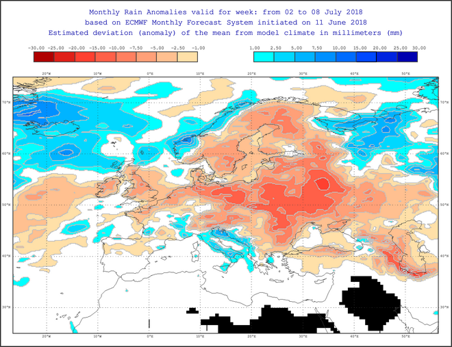 Με αξιόλογα ποσά βροχοπτώσεων θα φύγει ο φετινός Ιούνιος σύμφωνα με τα προγνωστικά στοιχεία του κλιματικού μοντέλου S5 του Ευρωπαικού Κέντρου Μεσοπρόθεσμων Προγνώσεων (ECMWF) . Το αξιόπιστο, πρόγραμμα της ΕΕ τρέχει στα πλαίσια του Copernicus και υποστηρίζει το EFFIS -European Forest Fire Information System , ένα σημαντικό σημαντικό “εργαλείο” για το έργο της Πυροσβεστικής και της Γενικής Γραμματείας Πολιτικής Προστασίας. Στον παραπάνω χάρτη μπορούμε να διακρίνουμε οτι στον κορμό της ηπειρωτικής Ελλάδος θα έχουμε τιμές βροχής κατά 5 με 10 mm πάνω από τον μέσο όρο.