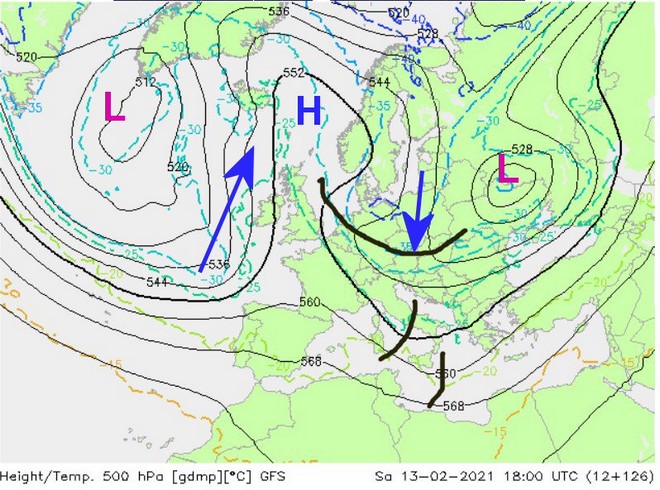 Όπως βρίσκεται ο αντικυκλώνας στη Βόρεια Ευρώπη, αν πάμε λίγο πιο κάτω θα παρατηρήσουμε ότι από την δεξιά μεριά στην κάτω πλευρά αυτού του χάρτη (τα κατάντη) δημιουργούνται και περνάνε διαδοχικές διαταραχές. Στο παραπάνω video όμως είδαμε ότι τελικώς η κυκλοφορία δεν γίνεται ποτέ ΒΑ στην περιοχή μας. Όλη αυτή η διαδικασία συμβαίνει διότι η κυκλοφορία της ατμόσφαιρας στην Βόρεια Ευρώπη δεν μπορεί μέχρι στιγμής να μετατραπεί τελικώς σε φρασσομένη τύπου «Ωμέγα» (Omega Blocking ) όπως χαρακτηριστικά αναφέρουν στο “Εγχειρίδιο του Μετεωρολόγου” οι Ζιακόπουλος και Φραγκούλη . Αυτό βέβαια δεν σημαίνει ότι δεν θα έχουμε φαινόμενα, απλά με μια πρώτη ματιά όλα τα στοιχεία δείχνουν ότι δεν θα έχουμε μεγάλη υποστήριξη των διαταραχών από την ανώτερη ατμόσφαιρα.