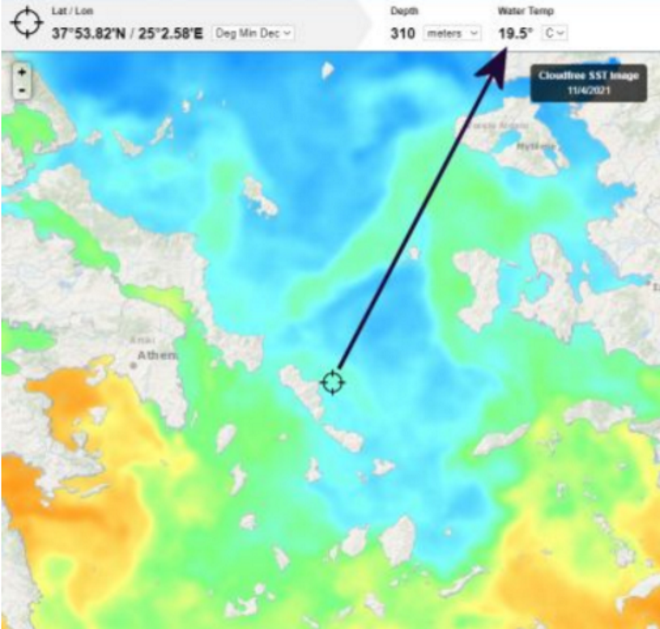 Η θερμοκρασία από την Πέμπτη 4 Νοεμβρίου 2021 σε πολλές περιοχές έφτασε τους 26 με 27 βαθμούς, πολύ πάνω από τα κανονικά για την εποχή επίπεδα. Στη θάλασσα, όμως, η θερμοκρασία ήταν κοντά στους 19 βαθμούς, καθώς το νερό έχει μεγαλύτερη θερμοχωρητικότητα από τον αέρα και δεν είχε προλάβει να θερμανθεί από τη ζέστη των ημερών.