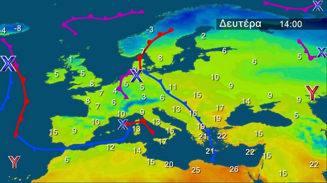 Τη Δευτέρα θα επικρατήσει βροχερός καιρός σε όλη τη χώρα. Σποραδικές καταιγίδες θα εκδηλωθούν στα δυτικά, τα βόρεια, την ανατολική και νότια νησιωτική χώρα. Τα φαινόμενα πιθανώς να είναι πρόσκαιρα ισχυρά στα δυτικά τις πρωινές ώρες, βαθμιαία όμως το μεσημέρι και από τα βορειοδυτικά θα εξασθενήσουν. Οι άνεμοι στα δυτικά θα πνέουν από νότιες διευθύνσεις, στα πελάγη τοπικά 6 μποφόρ, με γρήγορη εξασθένηση στο Ιόνιο. Η θερμοκρασία θα σημειώσει μικρή πτώση ως προς τις μέγιστες τιμές της και θα φτάσει τους 18 βαθμούς στα βόρεια, στα υπόλοιπα ηπειρωτικά και το Ιόνιο τους 20 με 21 και στα νησιά του Αιγαίου τους 21 βαθμούς Κελσίου.