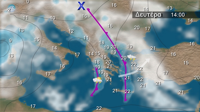 Στον χάρτη της Βαλκανικής διακρίνεται το μέτωπο που θα περάσει πάνω από την χώρα μας.