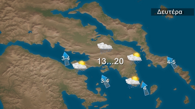 Τη Δευτέρα προβλέπονται νεφώσεις με τοπικές βροχές και σποραδικές καταιγίδες πιθανώς κατά τόπους ισχυρές στα δυτικά, το ανατολικό Αιγαίο, την ανατολική Μακεδονία και τη Θράκη. Από το μεσημέρι στα βορειοδυτικά ο καιρός θα βελτιωθεί και βαθμιαία από το απόγευμα τα φαινόμενα θα εξασθενήσουν και στην υπόλοιπη χώρα, εκτός από τα βορειοανατολικά.