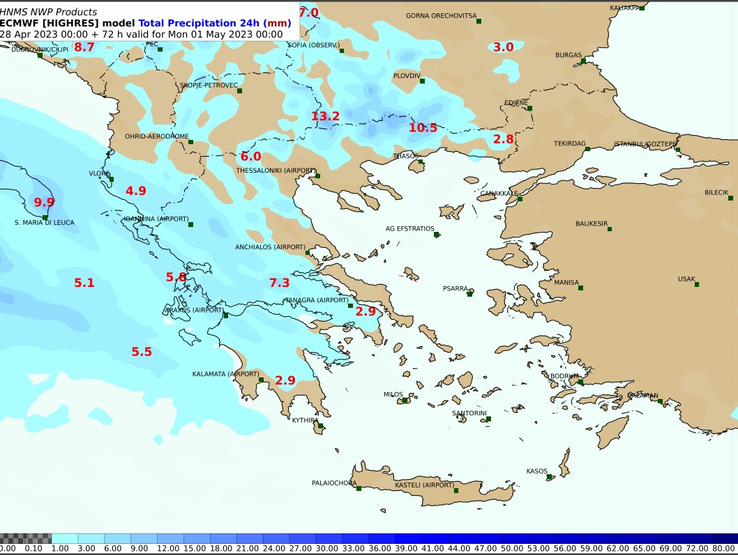 Ανήμερα την Πρωτομαγιά (Δευτέρα) προβλέπονται νεφώσεις με τοπικές βροχές και μεμονωμένες καταιγίδες αρχικά στα δυτικά και βαθμιαία στα κεντρικά και τα νότια. Το βράδυ τα φαινόμενα θα περιοριστούν στα βορειοδυτικά. Στις υπόλοιπες περιοχές θα υπάρχουν αραιές νεφώσεις που βαθμιαία θα πυκνώσουν και θα σημειωθούν τοπικές βροχές ή όμβροι το μεσημέρι – απόγευμα στα ηπειρωτικά κυρίως ορεινά.