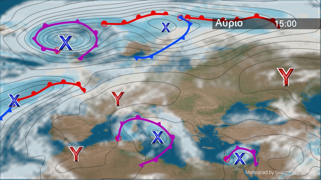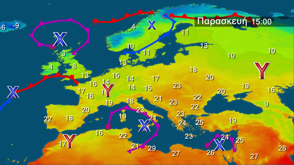 Στον γενικό χάρτη της Ευρώπης διακρίνονται ισχυρά βαρομετρικά χαμηλά στα Βόρεια της Ευρώπης . Το σύστημα που προκάλεσε έντονα προβλήματα στην Ισπανία θα επηρεάσει την Ιταλία αλλά δεν θα κινηθεί περαιτέρω ανατολικότερα για να μας επηρεάσει.