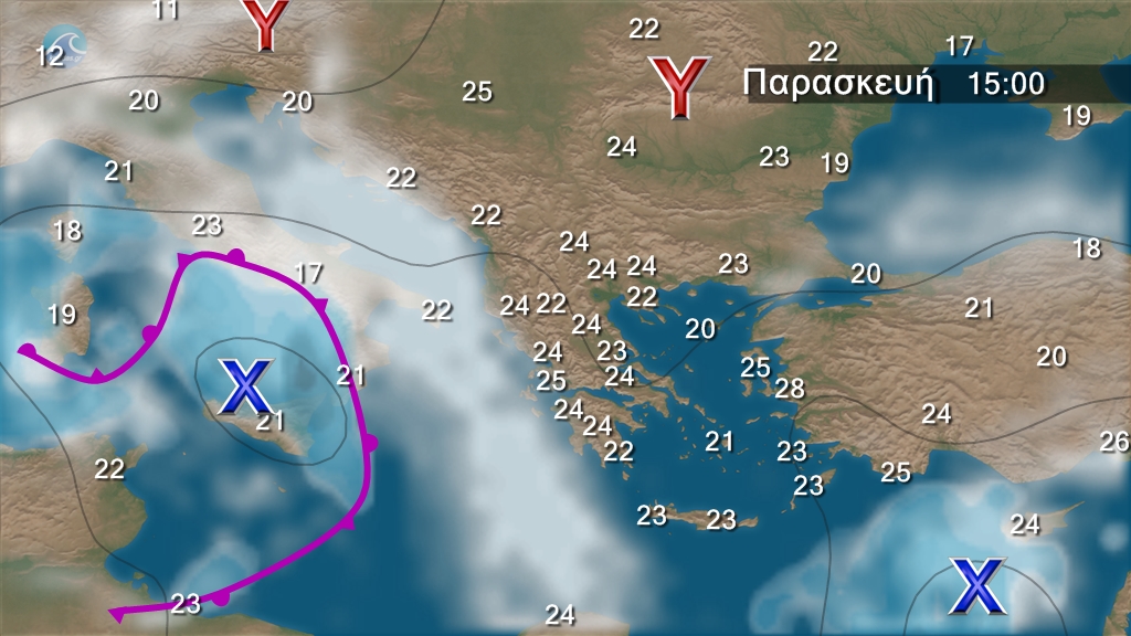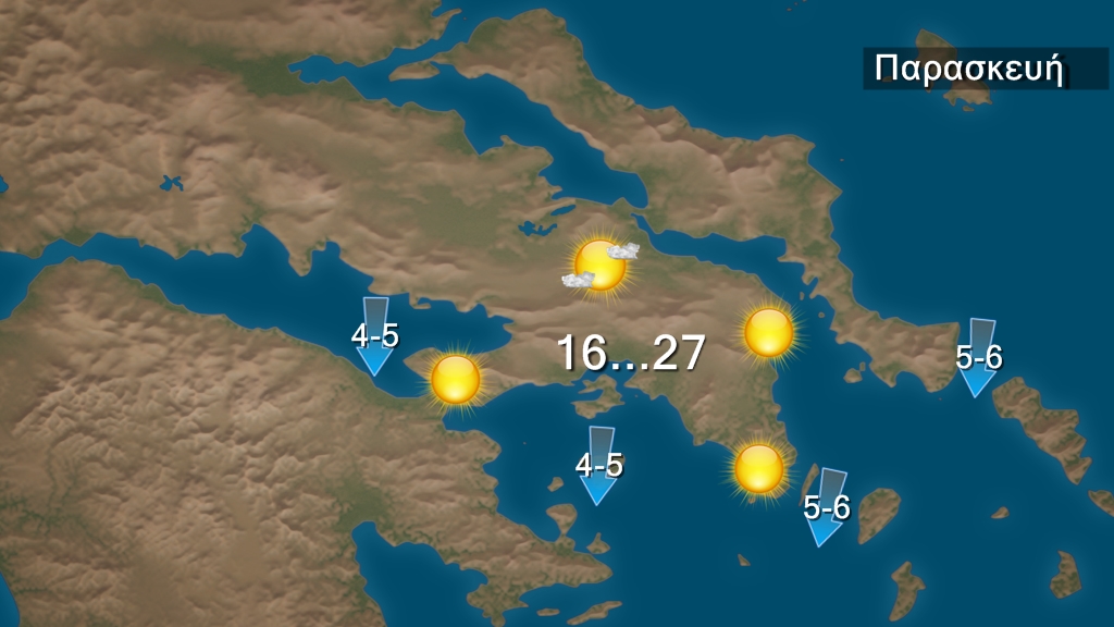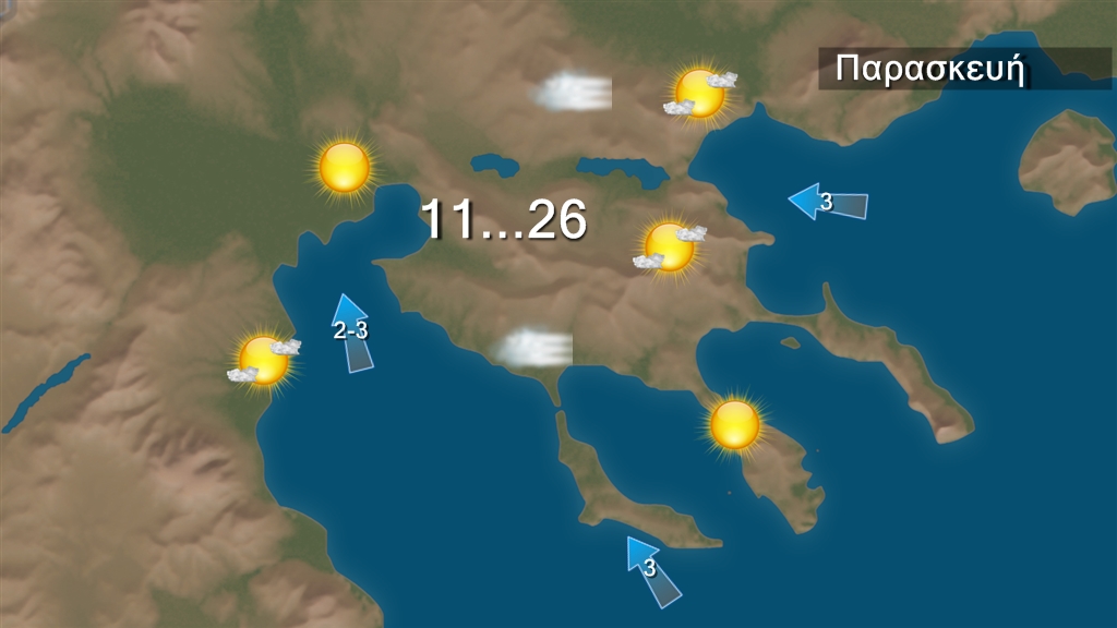 Γενικά αίθριος καιρός την Παρασκευή και μόνο στα δυτικά και νότια θα αναπτυχθούν τοπικές νεφώσεις. Οι άνεμοι θα πνέουν από βόρειες διευθύνσεις στο Ιόνιο 3-4 μπ και στο Αιγαίο 5 με 6 μποφόρ. Μέχρι και τη Δευτέρα ο καιρός θα διατηρηθεί γενικά αίθριος με τοπικές νεφώσεις στα δυτικά και νότια ενώ οι άνεμοι δεν θα ξεπερνούν στο Αιγαίο τα 5 με 6 μποφόρ. Η θερμοκρασία θα παραμείνει στα ίδια επίπεδα.