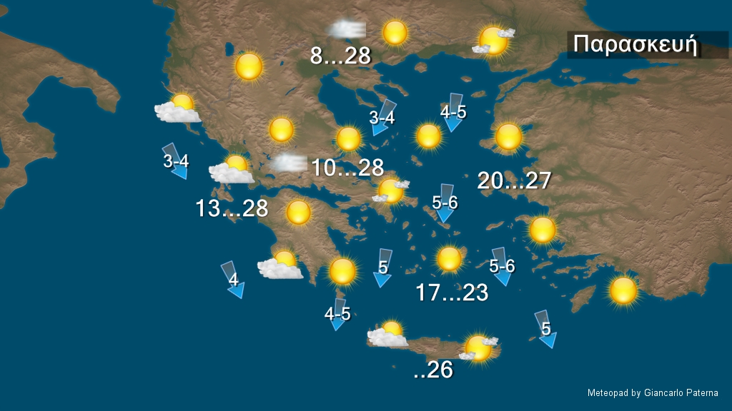 Την Παρασκευή προβλέπεται γενικά αίθριος καιρός με λίγες νεφώσεις στα Δυτικά και στη βόρεια Κρήτη. Τοπικά περιορισμένη ορατότητα τις πρωινές και βραδινές ώρες στα δυτικά και βόρεια. Οι άνεμοι, στα δυτικά μεταβλητοί 3-4 ς, στα ανατολικά θα πνέουν από βόρειες διευθύνσεις 3 με 5 και στο Αιγαίο τοπικά 6 μποφόρ. Η θερμοκρασία δε θα σημειώσει αξιόλογη μεταβολή και θα φτάσει τους 28 βαθμούς στα βόρεια , στα υπόλοιπα ηπειρωτικά και το Ιόνιο τους 28 με 29 και στα νησιά του Αιγαίου τους 23 με 27 βαθμούς Κελσίου.