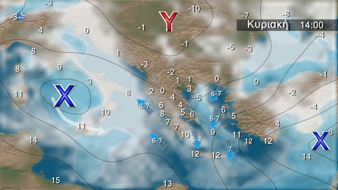 Στα βορειοδυτικά γενικά αίθριος καιρός. Στις υπόλοιπες περιοχές νεφώσεις κατά περιόδους αυξημένες με τοπικές βροχές ή χιονόνερο. Χιόνια θα πέσουν στα ορεινά, τα ημιορεινά, τα βορειοανατολικά πεδινά καθώς και σε περιοχές με χαμηλό υψόμετρο της κεντρικής χώρας. Οι άνεμοι θα πνέουν από βόρειες διευθύνσεις 4 με 6, στα πελάγη τοπικά 7 και στο Αιγαίο πιθανώς έως 8 μποφόρ. Η θερμοκρασία θα σημειώσει νέα πτώση στα ανατολικά. Παγετός θα σημειωθεί στα ηπειρωτικά τις πρωινές και βραδινές ώρες, κατά τόπους ισχυρός στα κεντρικά και τα βόρεια.