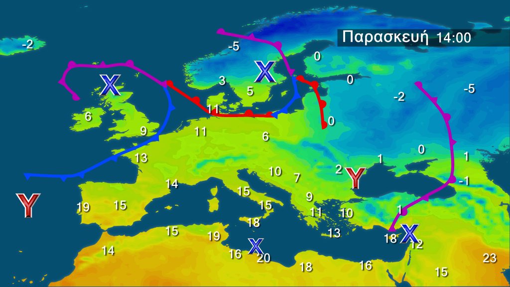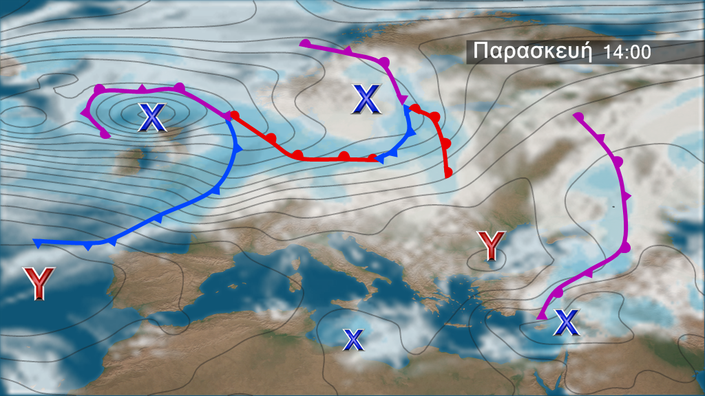 Με παροδικές νεφώσεις θα κυλήσει ο καιρός την Παρασκευή σε μεγάλο μέρος της ανατολικής χώρας και θα εκδηλωθούν λίγες τοπικές βροχές στα ανατολικά και νότια. Στον χάρτη των βαρομετρικών συστημάτων της Ευρώπης παρατηρούμε ότι ο αντικυκλώνας της κεντρικής Ευρώπης (βαρομετρικό υψηλό) που βρίσκεται στα Βαλκάνια έχει εξασθενήσει και αυτό πρακτικά σημαίνει ότι δεν είναι πλέον ισχυρός ο συνδυασμός του με το χαμηλό στη περιοχή της Ρόδου. Έτσι και το πεδίο των ανέμων στο Αιγαίο θα είναι εξασθενημένο.