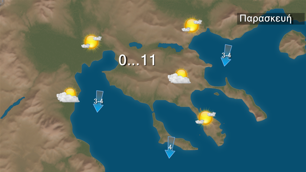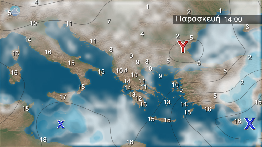 Στον χάρτη της Βαλκανικής που ακολουθεί διακρίνεται ότι ο συνδυασμός είναι εμφανής κυρίως στο Νοτιοανατολικό Αιγαίο με φαινόμενα βορείου ρεύματος δηλαδή ασθενείς βροχές στα ανατολικά και λίγα χιόνια στα βουνά της ηπειρωτικής χώρας αλλά και της Κρήτης . Οι άνεμοι μόνο στην αρχή της ημέρας στα νοτιοανατολικά θα φτάνουν τα 7 με 8 μποφόρ, ενώ αργότερα θα εξασθενήσουν. Η θερμοκρασία θα φτάσει στα βόρεια τους 11 βαθμούς, ενώ στα κεντρικά και τα νότια θα έχουμε μέγιστες θερμοκρασίες περί τους 13 με 17 βαθμούς Κελσίου.