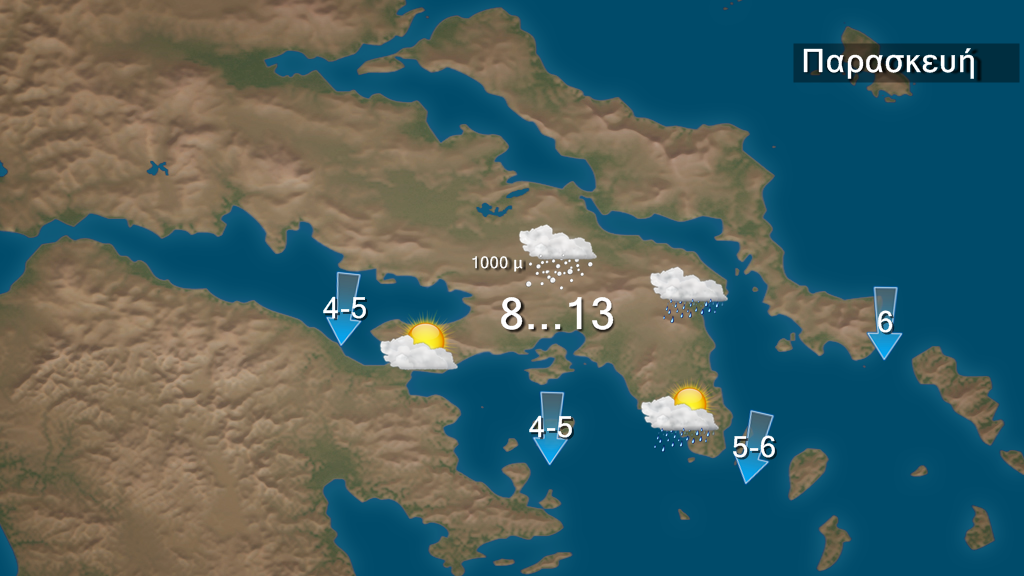 Στην Αττική προβλέπονται νεφώσεις παροδικά αυξημένες με ασθενείς βροχές στα βόρεια και ανατολικά, λίγα χιόνια πάνω τα 1000 μ στη Πάρνηθα που από το μεσημέρι θα σταματήσουν. Οι άνεμοι θα πνέουν ΒΑ 4 με 5 και τοπικά στα ανατολικά 6 μπ με μικρή εξασθένηση από το απόγευμα. Η θερμοκρασία θα φτάσει τους 13 βαθμούς Κελσίου.
