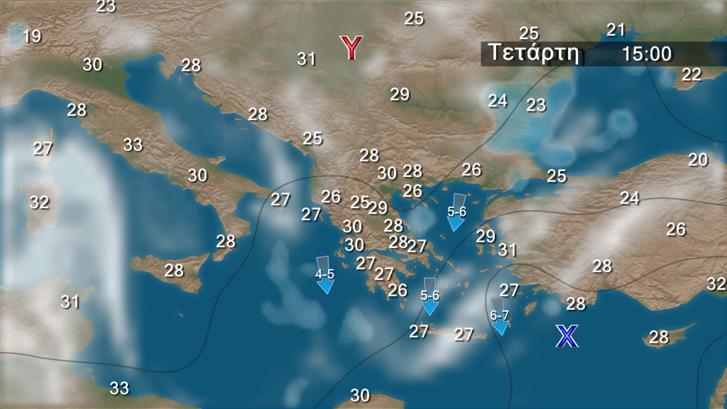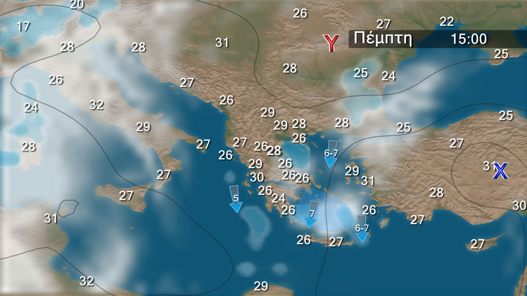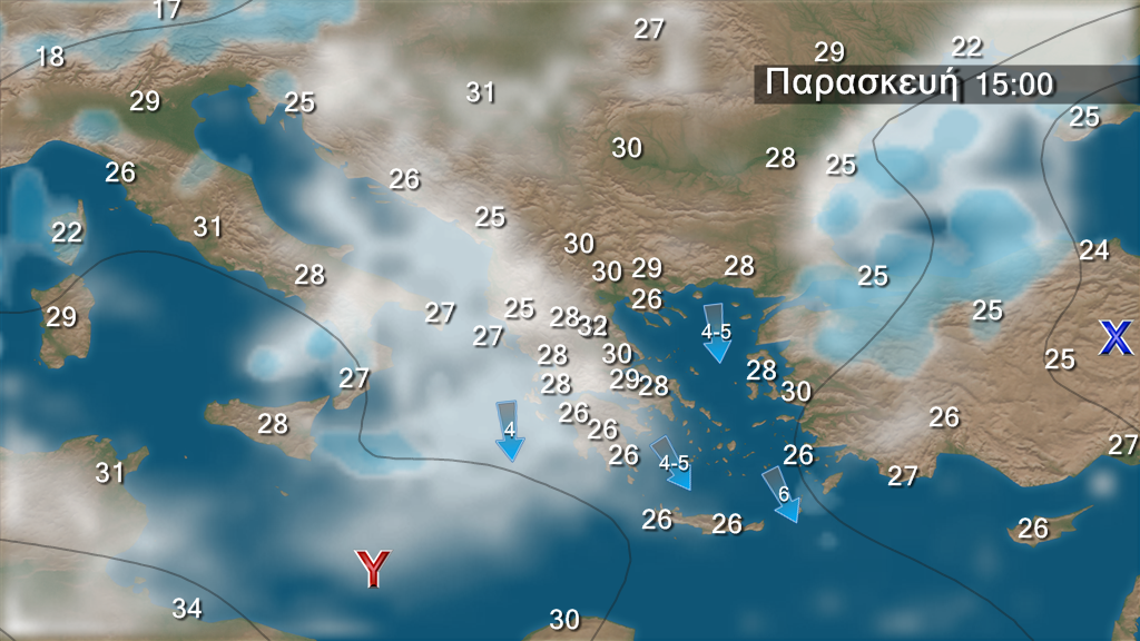 Σήμερα στις περισσότερες περιοχές προβλέπεται σχεδόν αίθριος καιρός με παροδικά φαινόμενα στα βορειοανατολικά και αργότερα στα νοτιοδυτικά κυρίως τμήματα. Οι άνεμοι θα πνέουν Βόρειοι μέτριοι 4 με 6 και τοπικά στο νοτιοανατολικό Αιγαίο 6 με 7 μποφόρ. Η θερμοκρασία θα φτάσει τους 32 με 32 βαθμούς στο Ιόνιο και τα ηπειρωτικά και τους 28 με 31 βαθμούς στο Αιγαίο.
