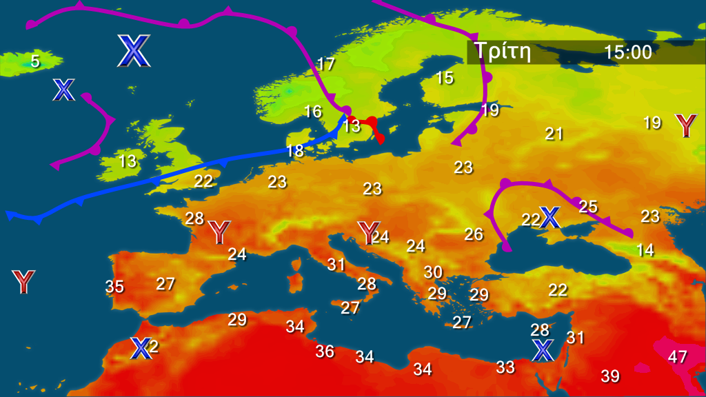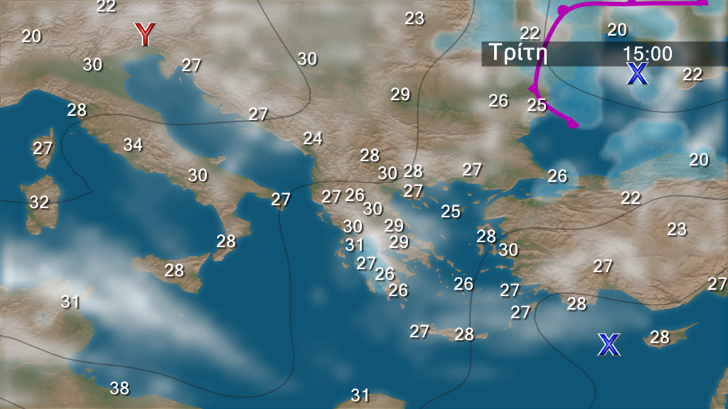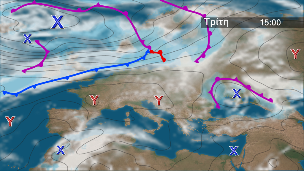 Για την σημερινή ημέρα στη νότια Ευρώπη δεν υπάρχει κάποιο αξιόλογο σύστημα για να μας επηρεάσει και θα έχουμε μόνο την ενίσχυση του συνδυασμού του αντικυκλώνα της Βαλκανικής με τις χαμηλές της ανατολικής Μεσογείου.