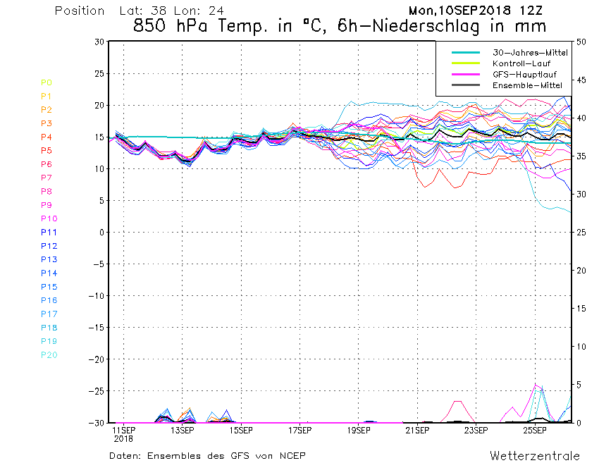 Παροδικές μπόρες ή καταιγίδες θα εκδηλωθούν το επόμενο τριήμερο κυρίως στα ανατολικά και νότια, θα ενισχυθούν οι βοριάδες και θα πέσει η θερμοκρασία. Από την Παρασκευή ο καιρός και πάλι θα βελτιωθεί , οι άνεμοι θα εξασθενήσουν και θα ανέβει η θερμοκρασία . Όλα τα δεδομένα αυτά απεικονίζονται στο παρακάτω μετεώγραμμα που αφορά στην Αθήνα, όπου μεταξύ άλλων παρατηρούμε ότι θερμοκρασία στα 850 hPa (μαύρη γραμμή) έχει τιμές γύρω στους 15 βαθμούς και συνεπώς η θερμοκρασία μετά τις 16 του μηνός θα ξαναγυρίσει πάλι σε επίπεδα γύρω στους 30 βαθμούς Κελσίου.