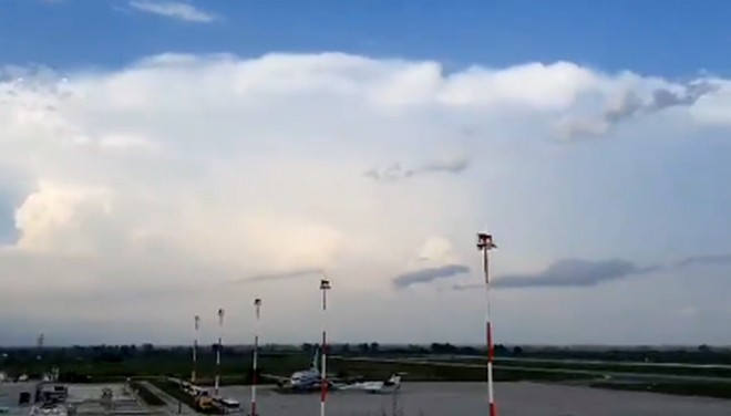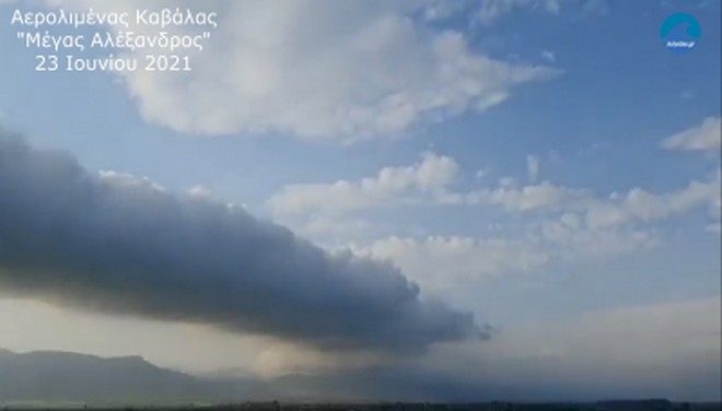 Ένας πολύ σπάνιος σχηματισμός νεφών εμφανίστηκε τις απογευματινές ώρες της Τετάρτης 23 Ιουνίου 2021, στις άκρες μιας καταιγίδας στη Χρυσούπολη στον Αερολιμένα της Καβάλας “Μέγας Αλέξανδρος”. Χάρη στην άμεση αντίδραση και οξυδέρκεια της μετεωρολόγου βάρδιας, κατεγράφη αυτό το σπάνιο Κυλινδρικό Νέφος (Roll Cloud) σε video.