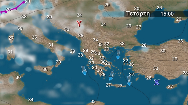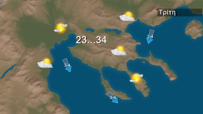 Την Τετάρτη προβλέπεται καιρός γενικά αίθριος, με παροδικές νεφώσεις τις μεσημβρινές και απογευματινές ώρες στα κεντρικά και βόρεια ορεινά με πιθανότητα όμβρων στα βορειοδυτικά. Οι άνεμοι θα πνέουν από βόρειες διευθύνσεις στα δυτικά 3 με 4, στα ανατολικά 4 με 6 μποφόρ. Η θερμοκρασία δεν θα παρουσιάσει αξιόλογη μεταβολή.