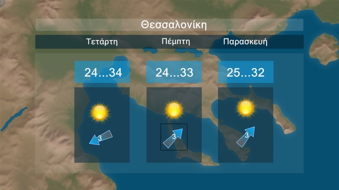 Στη Θεσσαλονίκη προβλέπεται αίθριος καιρός με τοπικές νεφώσεις τις μεσημβρινές και απογευματινές ώρες. Οι άνεμοι θα πνέουν μεταβλητοί και πρόσκαιρα βορειοδυτικοί 3 με 4 μποφόρ. Η θερμοκρασία θα κυμανθεί από 23 έως 34 βαθμούς Κελσίου.