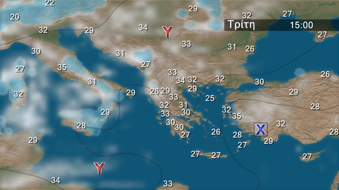 Σήμερα σε όλη τη χώρα θα επικρατήσει σχεδόν αίθριος καιρός και μόνο στα βόρεια ορεινά το μεσημέρι και το απόγευμα θα συννεφιάσει τοπικά και υπάρχει πιθανότητα να εκδηλωθούν τοπικές μπόρες στα βορειοδυτικά ορεινά. Η θερμοκρασία σε καμία περιοχή δεν θα ξεπεράσει τους 35 με 36 βαθμούς Κελσίου στα ηπειρωτικά και το Ιόνιο και τους 29 με 32 βαθμούς στα νησιά του Αιγαίου. Πρόσκαιρα στο Κεντρικό και το Νότιο Αιγαίο οι άνεμοι θα φτάνουν τις μεσημεριανές κυρίως ώρες τα 6 με 7 μποφόρ.