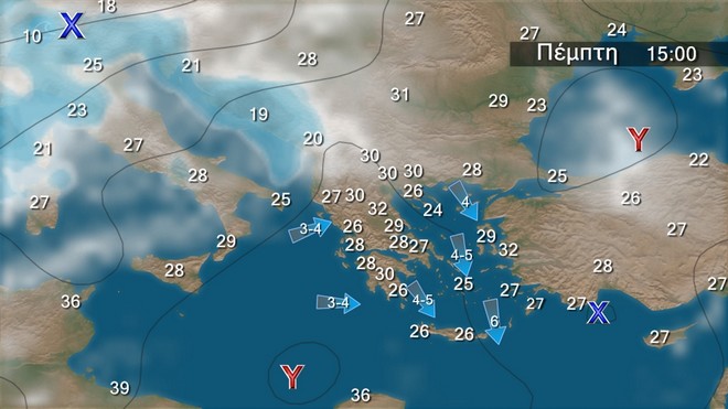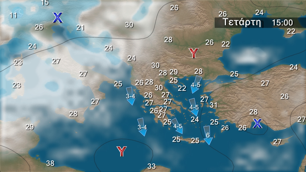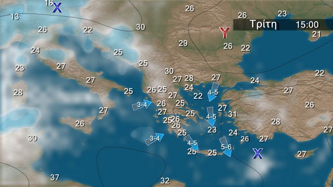 Στα ανατολικά ηπειρωτικά, τις Σποράδες, την Εύβοια, τις Κυκλάδες και την Κρήτη λίγες νεφώσεις παροδικά αυξημένες με τοπικές βροχές κυρίως μέχρι το μεσημέρι στην Κρήτη. Στην υπόλοιπη χώρα γενικά αίθριος καιρός με πρόσκαιρες τοπικές νεφώσεις στα βορειοδυτικά ορεινά τις μεσημβρινές και απογευματινές ώρες. Η ορατότητα θα είναι κατά τόπους περιορισμένη τις πρωινές και τις βραδινές ώρες στα δυτικά. Οι άνεμοι θα πνέουν από βόρειες διευθύνσεις, στα δυτικά 3 με 4,στα ανατολικά 4 με 6 και στο Αιγαίο τοπικά 7 μποφόρ. Η θερμοκρασία δεν θα σημειώσει αξιόλογη μεταβολή.