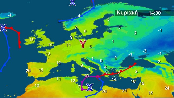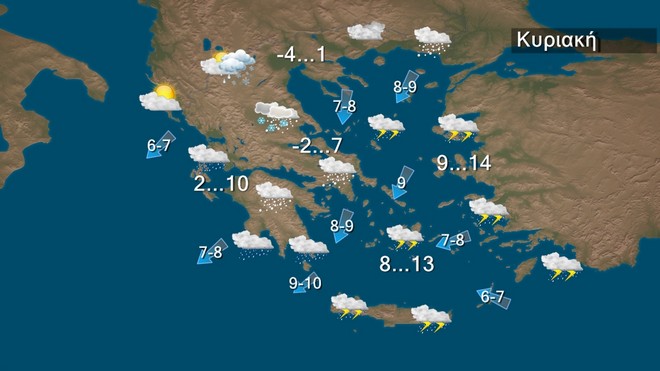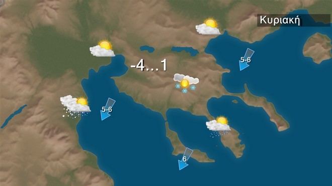 Στον χάρτη της Βαλκανικής που ακολουθεί παρατηρούμε ότι το κύριο χαμηλό που οργανώθηκε στο Ιόνιο κατευθύνεται προς τις ακτές της Αφρικής, αλλά τα μέτωπα του θα συνεχίζουν να μας επηρεάζουν. Έτσι θα συνεχιστούν τις πρωινές ώρες οι χιονοπτώσεις στη Θεσσαλία και τις Σποράδες και στην ανατολική Στερεά, την Εύβοια, τη βόρεια και ανατολική Πελοπόννησο που τις βραδινές ώρες θα εξασθενήσουν. Ισχυρές βροχές και καταιγίδες θα εκδηλωθούν κυρίως στις θαλάσσιες και παραθαλάσσιες περιοχές που θα περιοριστούν στις Κυκλάδες, την Κρήτη και τα Δωδεκάνησα Παγετός θα σημειωθεί τις βραδινές και τις πρωινές ώρες κυρίως στα ηπειρωτικά και η θερμοκρασία: θα φτάσει στα βόρεια τον 1 βαθμο στα δυτικά και τα υπόλοιπα ηπειρωτικά τους 10 και 7 βαθμούς αντίστοιχα και στα νησιά του Αιγαίου τους 13 με 14 βαθμούς Κελσίου.