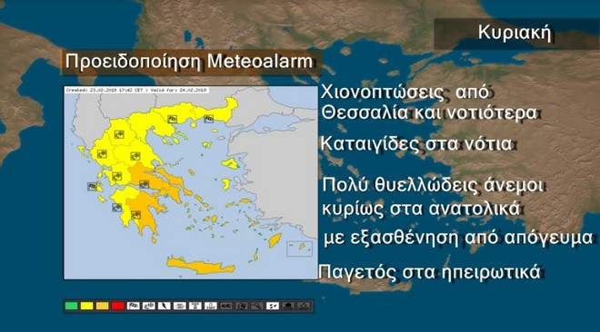 Συνεχίζεται η κακοκαιρία στη χώρα και θα επικρατήσουν χαμηλές θερμοκρασίες και θα έχουμε 8 με 9 και τοπικά ακόμη και 10 μποφόρ στο Αιγαίο και χιόνια σε ορεινά ημιορεινά αλλά και σε περιοχές με χαμηλότερο υψόμετρο κυρίως από τη Θεσσαλία και νοτιότερα όπως φαίνεται και στη προειδοποίηση του Meteoalarm.