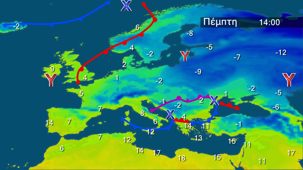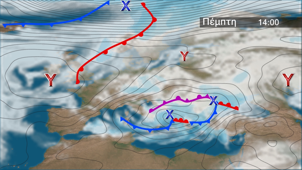 Με βροχές και καταιγίδες θα κυλήσει ο καιρός την Πέμπτη σε μεγάλο μέρος της χώρας κυρίως στα θαλάσσια – παράκτια τμήματα ενώ χιονοπτώσεις θα σημειωθούν στα ορεινά της ηπειρωτικής χώρας και πρόσκαιρα στα ημιορεινά της Βόρειας Ελλάδος που από το απόγευμα θα εξασθενήσουν. Στον χάρτη των βαρομετρικών συστημάτων της Ευρώπης παρατηρούμε το οργανωμένο σύστημα που έρχεται από τα δυτικά και κινούμενο ανατολικά επηρεάζει το μεγαλύτερο μέρος της χώρας.