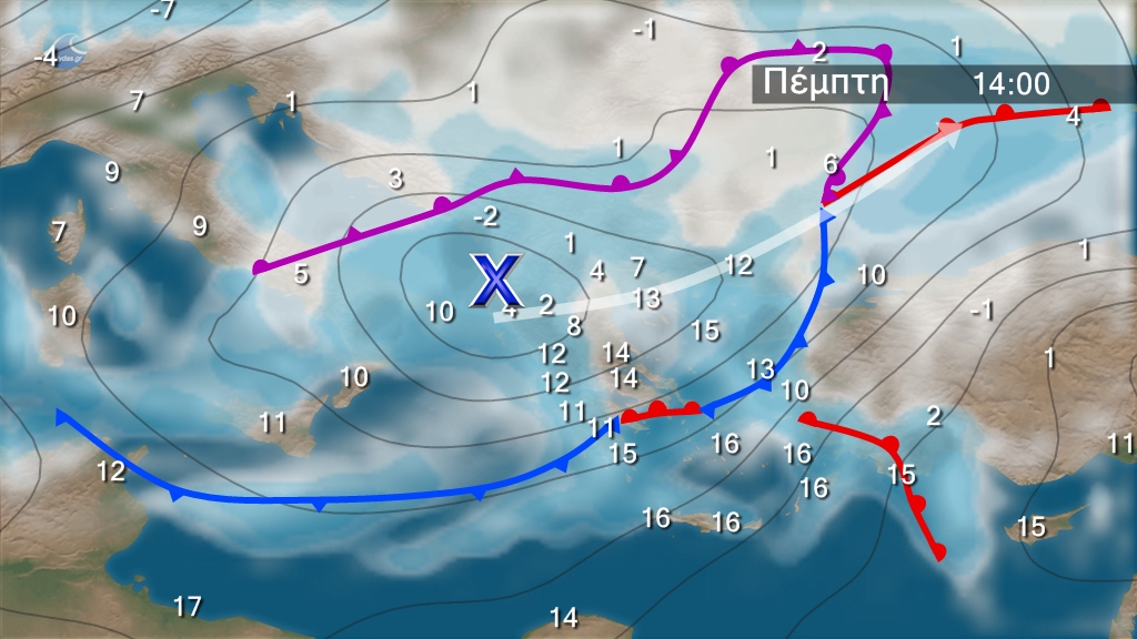 Στον χάρτη της Βαλκανικής που ακολουθεί διακρίνεται το βαρομετρικό χαμηλό που θα μας επηρεάσει με ισχυρές καταιγίδες στα δυτικά και χιονοπτώσεις στα ορεινά και ημιορεινά της βόρεια ηπειρωτικής χώρας Οι άνεμοι θα πνέουν νότιοι νοτιοδυτικοί 6 με 7 στα πελάγη 7-8 και για λίγο στο Αιγαίο 8 με 9 μποφόρ. Η θερμοκρασία θα παρουσιάσει άνοδο αλλά παρόλα αυτά θα σημειωθεί παγετός τις πρωινές και βραδινές ώρες στα κεντρικά και βόρεια, που μόνο τοπικά στα βόρεια θα είναι ισχυρός. Στα βόρεια θα έχουμε έως 7 βαθμούς μέγιστη θερμοκρασία, και στα υπόλοιπα τους 13 με 15 βαθμούς Κελσίου.