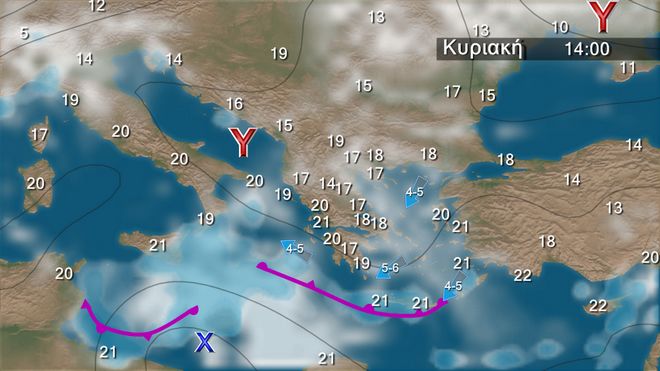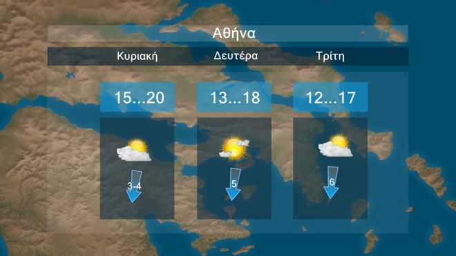 Την Κυριακή θα υπάρχει παροδική συννεφιά στα ανατολικά και νότια με λίγες βροχές στη Κρήτη ενώ οι άνεμοι θα φτάνουν τα 5 με 6 μποφόρ στο Αιγαίο. Από τη Δευτέρα και μετά ο καιρός θα ανοίξει περισσότερο και μέχρι τα μέσα της ερχόμενης εβδομάδος θα επικρατήσει σχεδόν αίθριος καιρός με πρόσκαιρα ενισχυμένους βοριάδες έως 7 μποφόρ και μικρή πτώση της θερμοκρασίας.