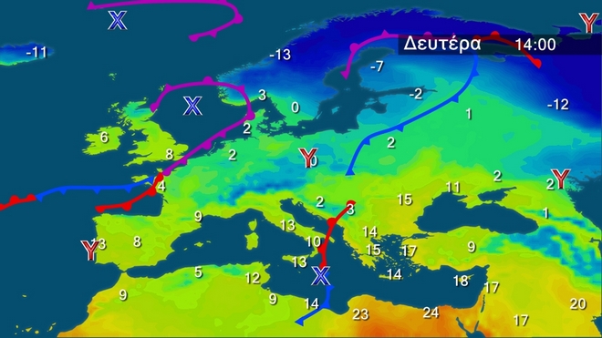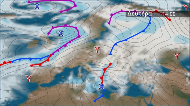 Στον χάρτη των βαρομετρικών συστημάτων της Ευρώπης παρατηρούμε το πολύ ισχυρό βαρομετρικό χαμηλό που επηρεάζει την Κεντρική Μεσόγειο και το οποίο θα κινηθεί ανατολικά και θα επηρεάσει τη χώρα μας με τοπικά έντονα φαινόμενα από την Τρίτη.