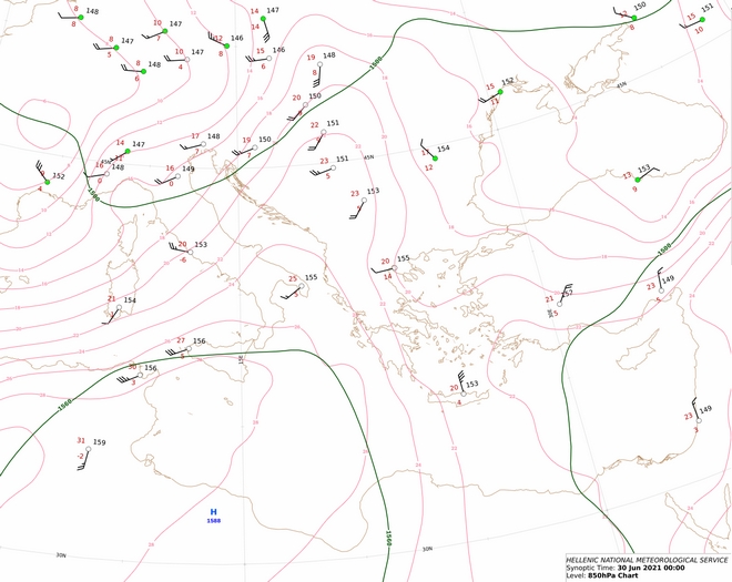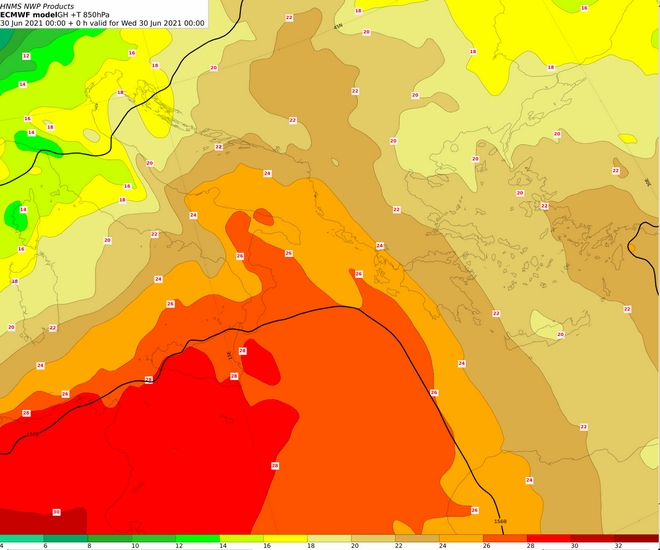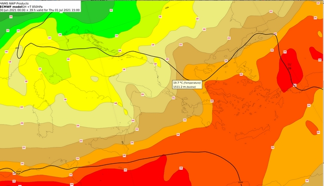 Όλη η θερμή αέρια μάζα που φαίνεται στην παραπάνω εικόνα και απεικονίζει τις αέριες μάζες στη στάθμη των 850 hPa θα κινηθούν ανατολικότερα και το μέγιστο αυτών των θερμοκρασιών θα παρατηρηθεί τις πρώτες απογευματινές ώρες της Πέμπτης.